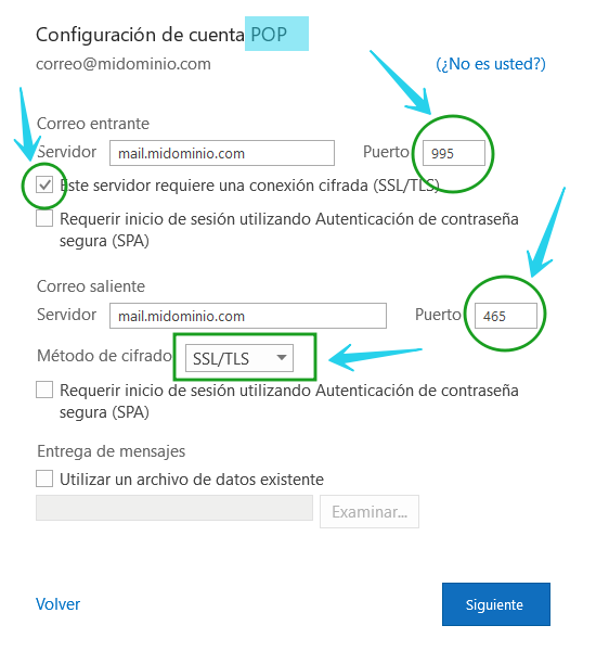Una vez en la ventana de configuración manual, introduce los datos del servidor entrante (POP) y saliente (SMTP). En el campo Servidor de correo entrante (POP), escribe la dirección proporcionada por tu proveedor (por ejemplo, pop.tudominio.com). En Servidor de correo saliente (SMTP), anota la dirección correspondiente (como smtp.tudominio.com). Asegúrate de especificar los puertos correctos: generalmente, el puerto para POP con SSL es 995 y para SMTP con SSL es 465 o 587. Marca la opción Este servidor requiere una conexión cifrada (SSL) si aplica. Estos ajustes son fundamentales en la Guía para configurar correo POP en Outlook para garantizar una conexión segura y funcional.